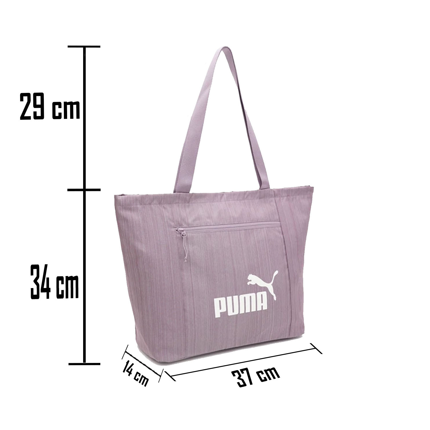 Bolsa Puma de diseño práctico y moderno, ideal para el día a día, gimnasio o salidas casuales. Su formato amplio permite llevar libros, ropa ligera o accesorios con comodidad. Cuenta con compartimento principal espacioso y bolsillo frontal con cierre para mantener objetos pequeños seguros y organizados. Incorpora asas largas para llevar al hombro con mayor confort. Fabricada en material resistente y ligero, ofrece durabilidad y fácil manejo. Su tono lila con el logotipo Puma al frente aporta un estilo deportivo y versátil que combina con cualquier outfit.