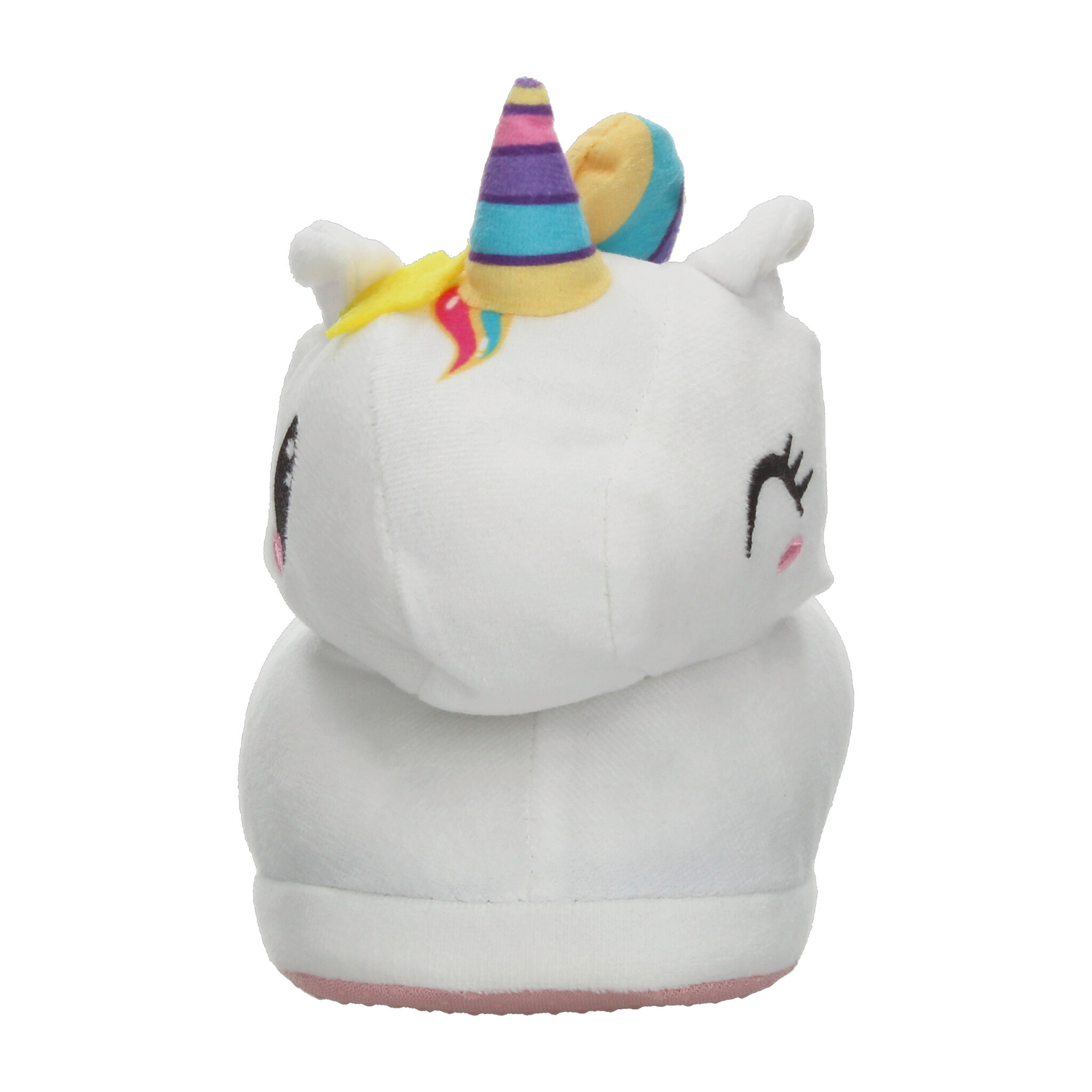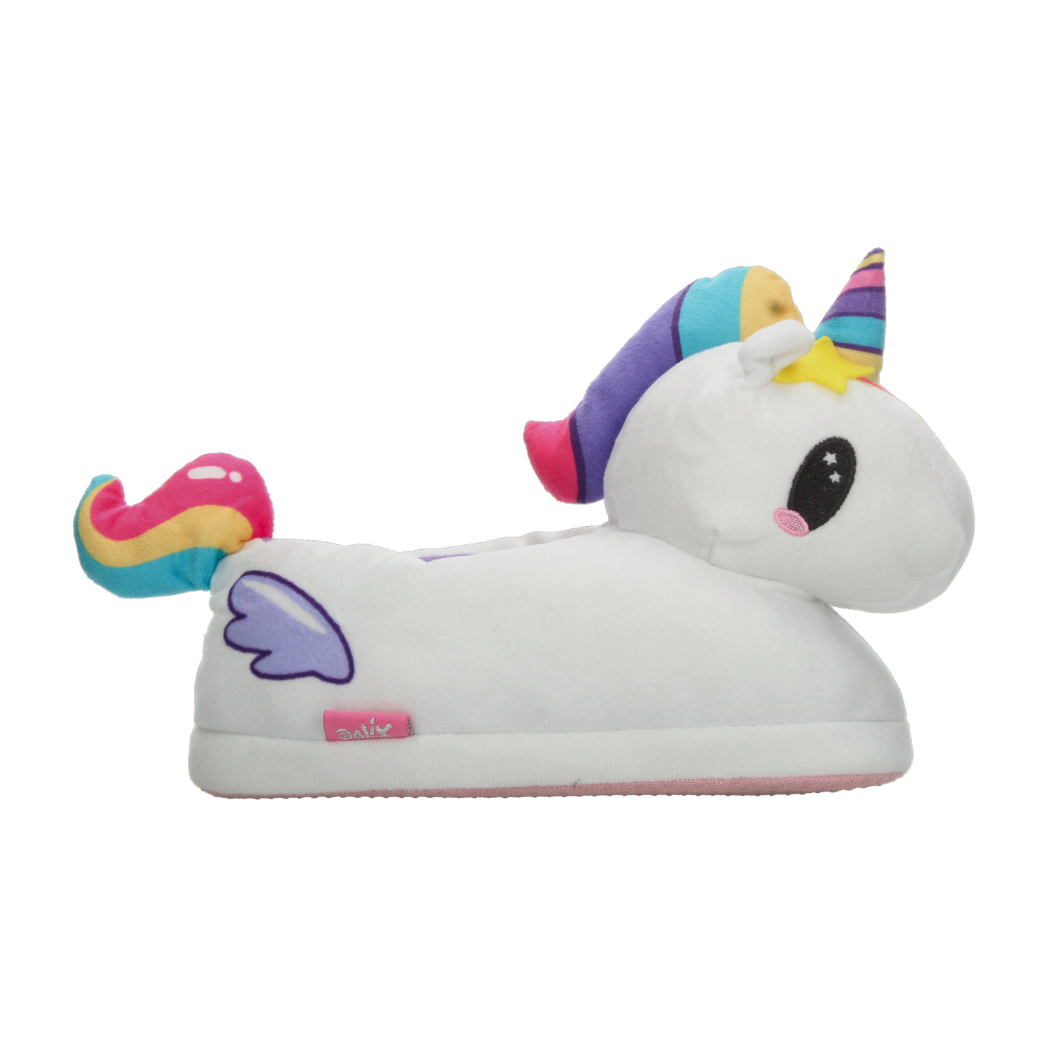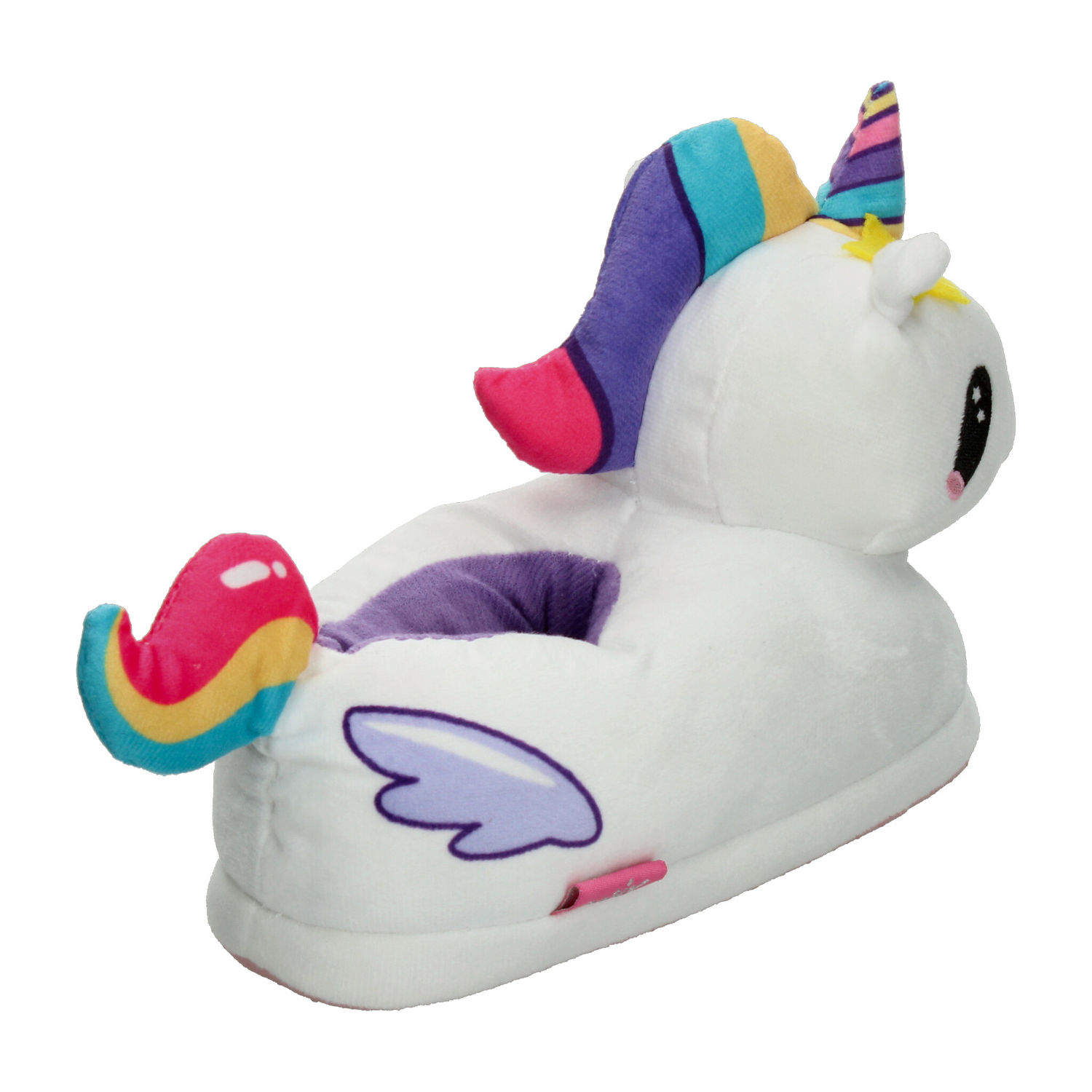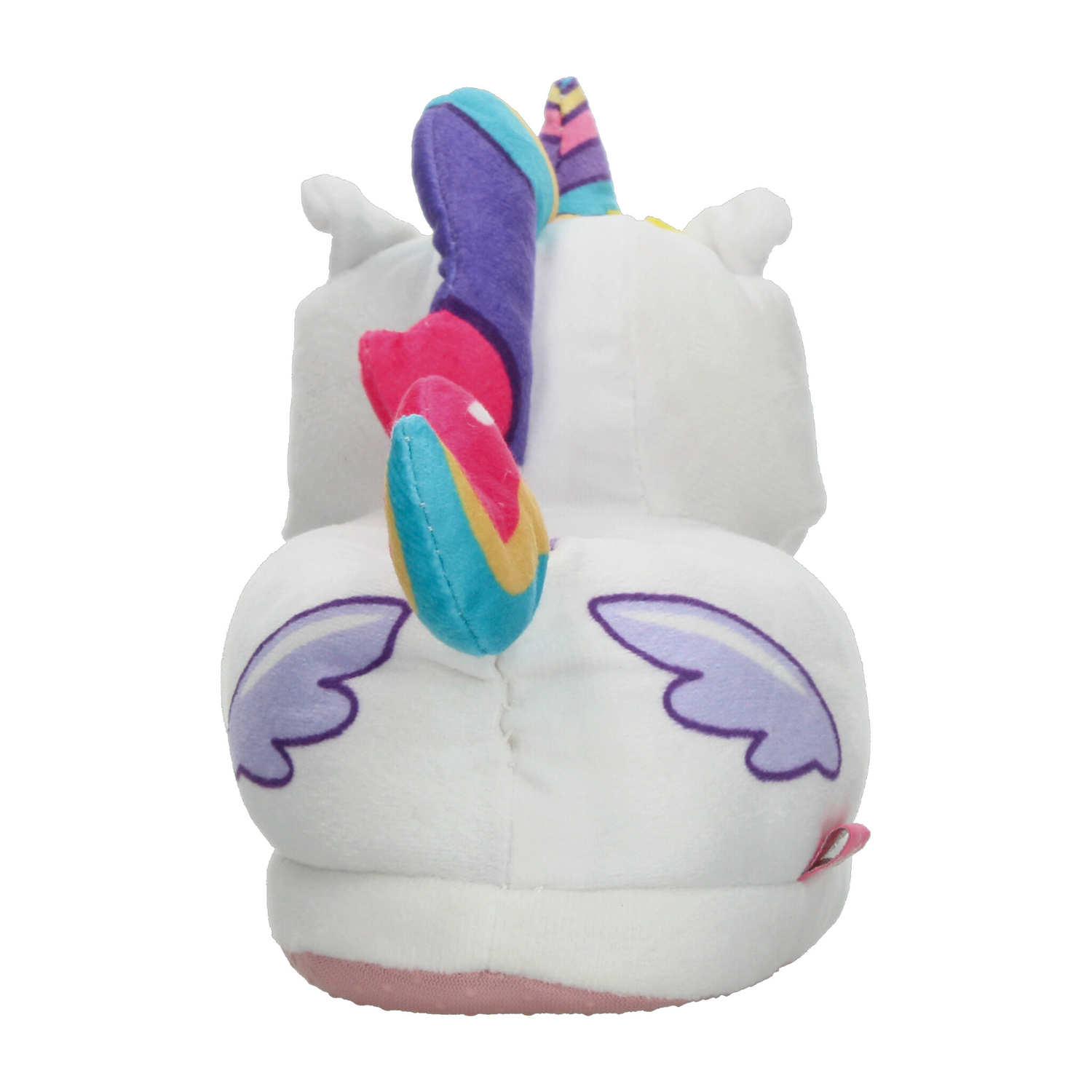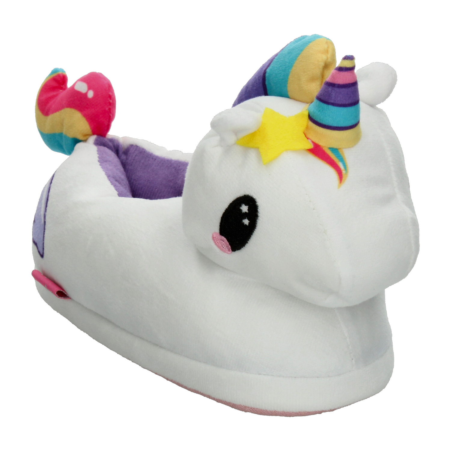 Pantufla con diseño de unicornio, ideal para mantener los pies cómodos y abrigados en casa. Su exterior está confeccionado en suave material de felpa blanca con detalles en colores vibrantes como el cuerno multicolor, estrellita amarilla y cola arcoíris, lo que la hace divertida y llamativa. Incluye interior afelpado en color morado que brinda mayor calidez y suavidad al caminar. La suela ligera ofrece un buen agarre en superficies lisas, proporcionando seguridad en cada paso. Perfecta para niñas que aman los diseños tiernos y mágicos, combinando confort y fantasía en un calzado de uso diario en el hogar.