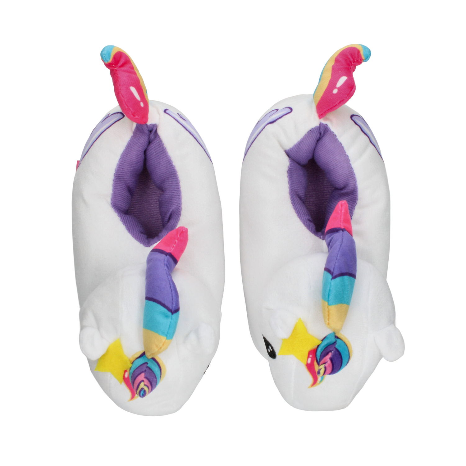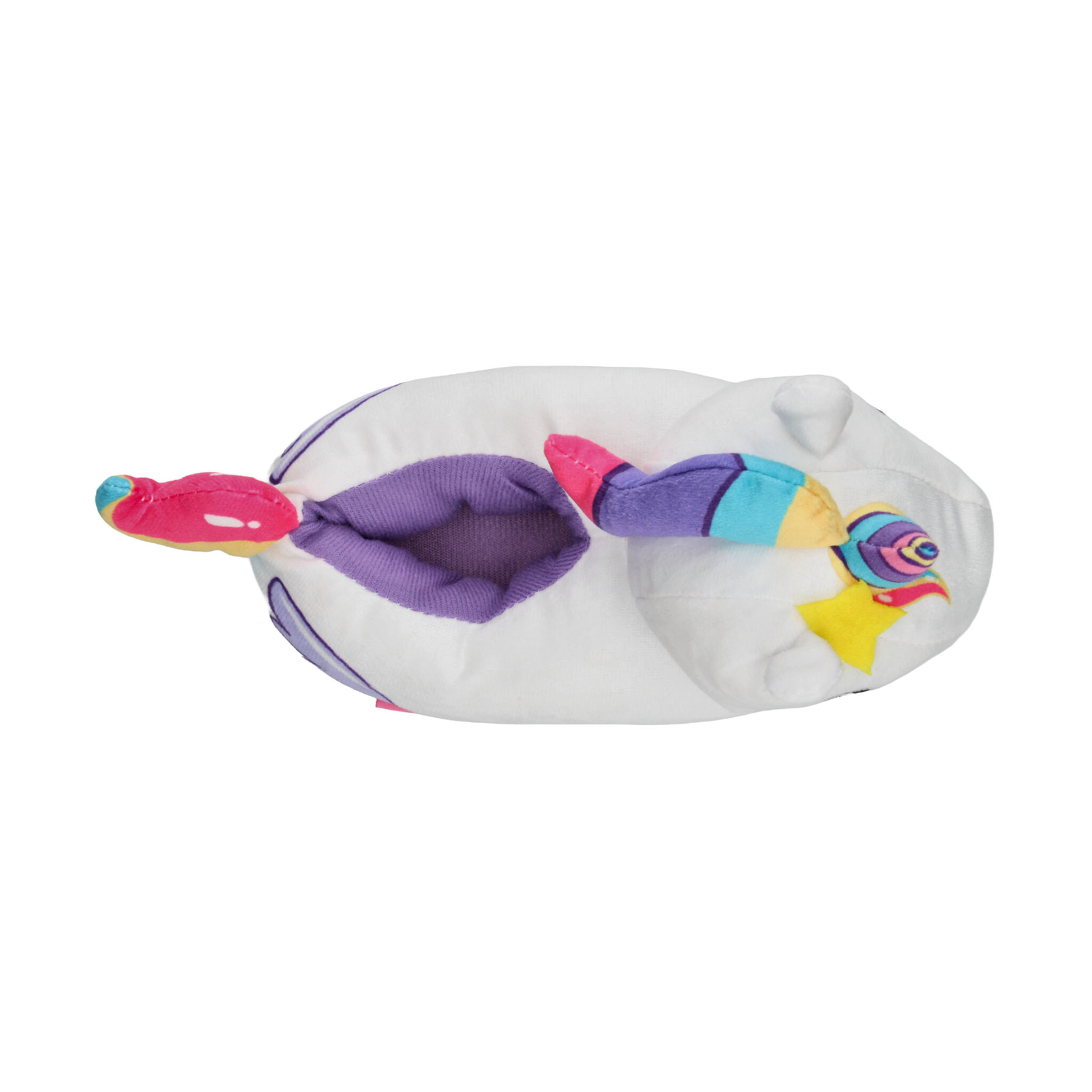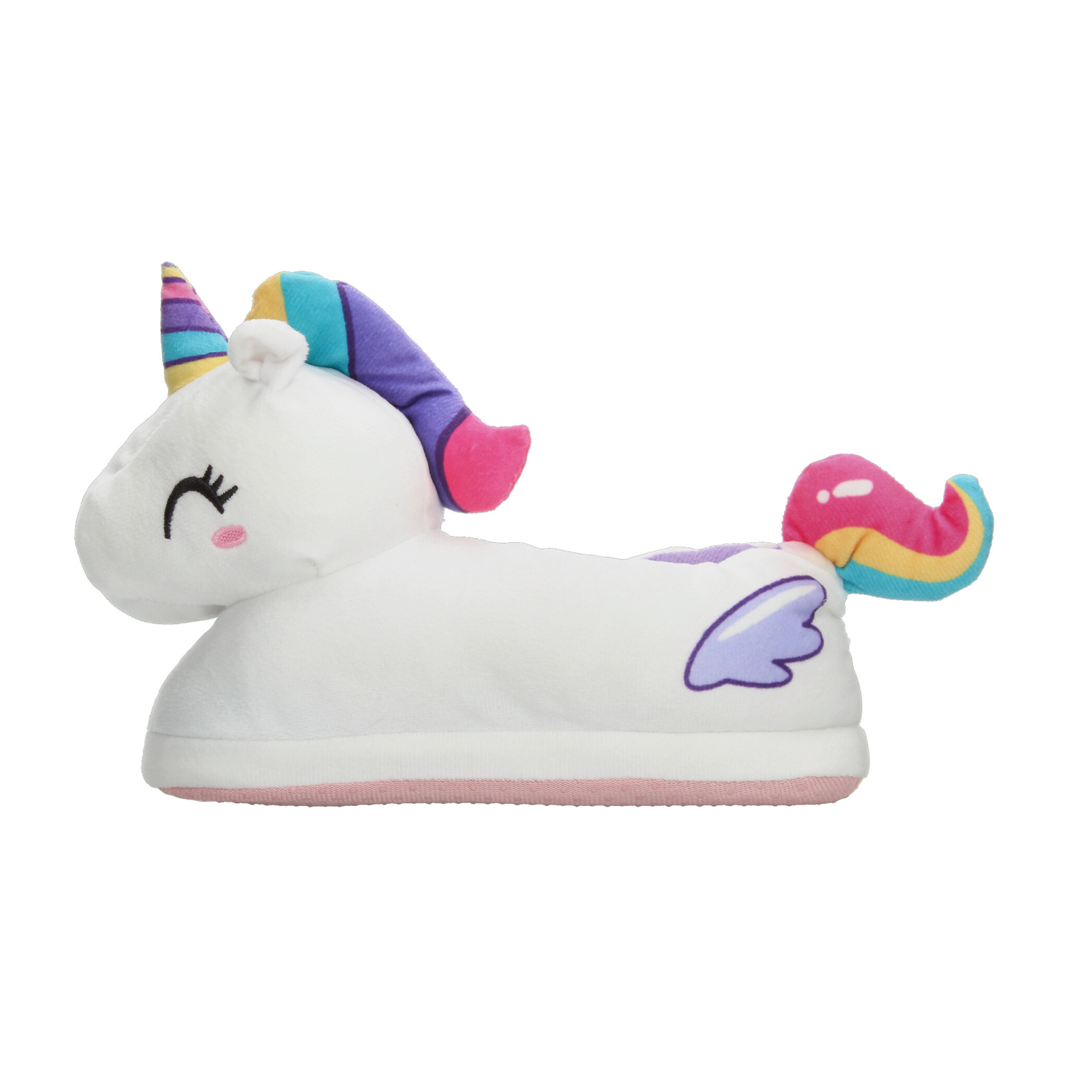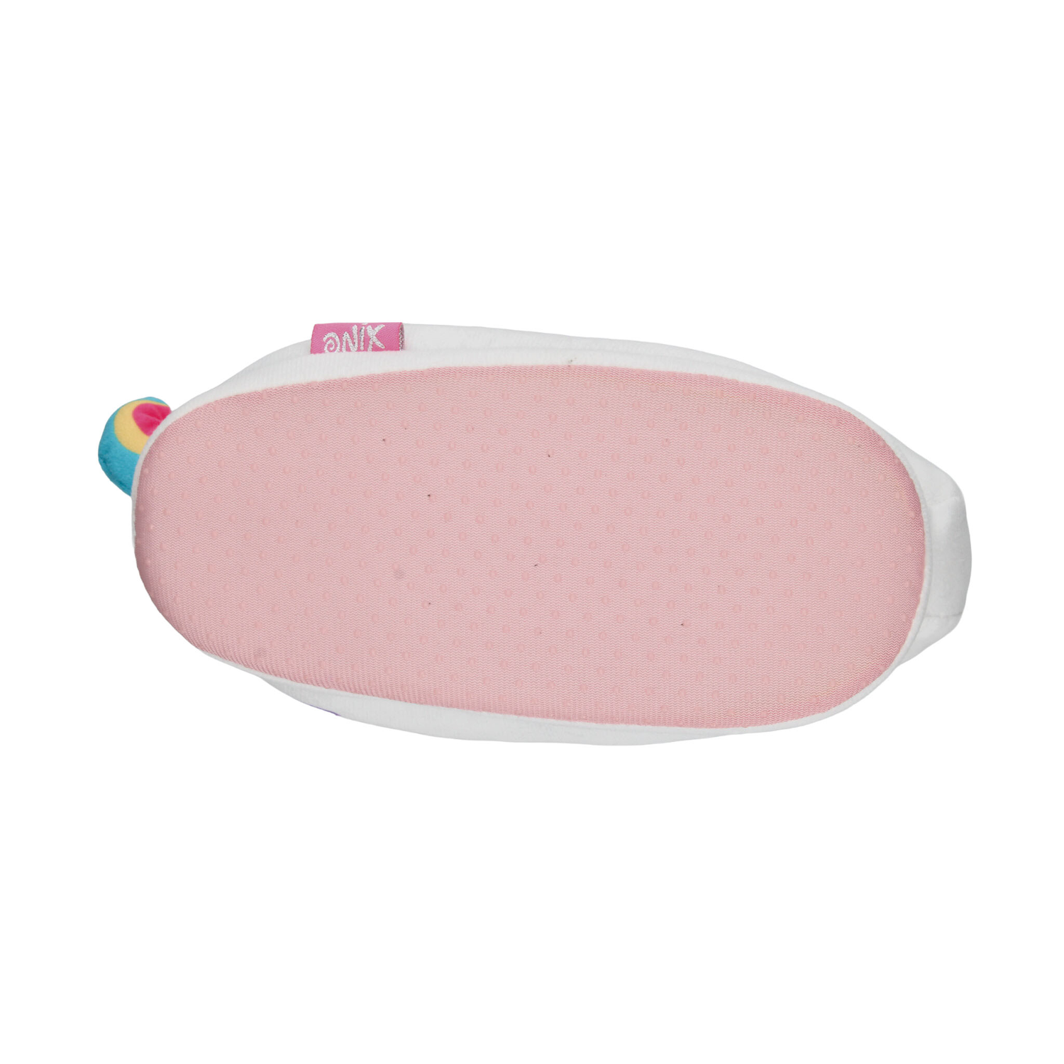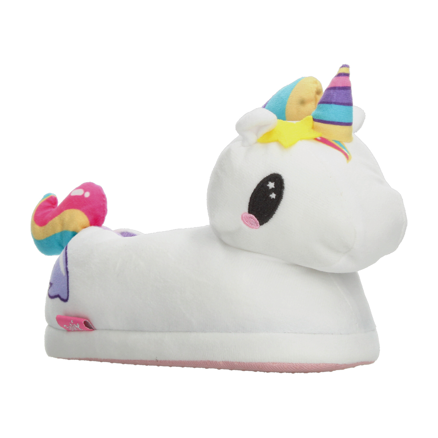Pantufla con diseño de unicornio, ideal para mantener los pies cómodos y abrigados en casa. Su exterior está confeccionado en suave material de felpa blanca con detalles en colores vibrantes como el cuerno multicolor, estrellita amarilla y cola arcoíris, lo que la hace divertida y llamativa. Incluye interior afelpado en color morado que brinda mayor calidez y suavidad al caminar. La suela ligera ofrece un buen agarre en superficies lisas, proporcionando seguridad en cada paso. Perfecta para niñas que aman los diseños tiernos y mágicos, combinando confort y fantasía en un calzado de uso diario en el hogar.