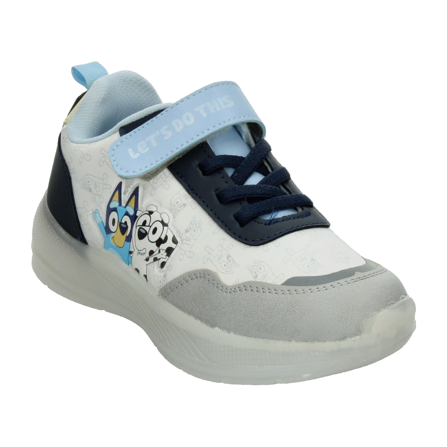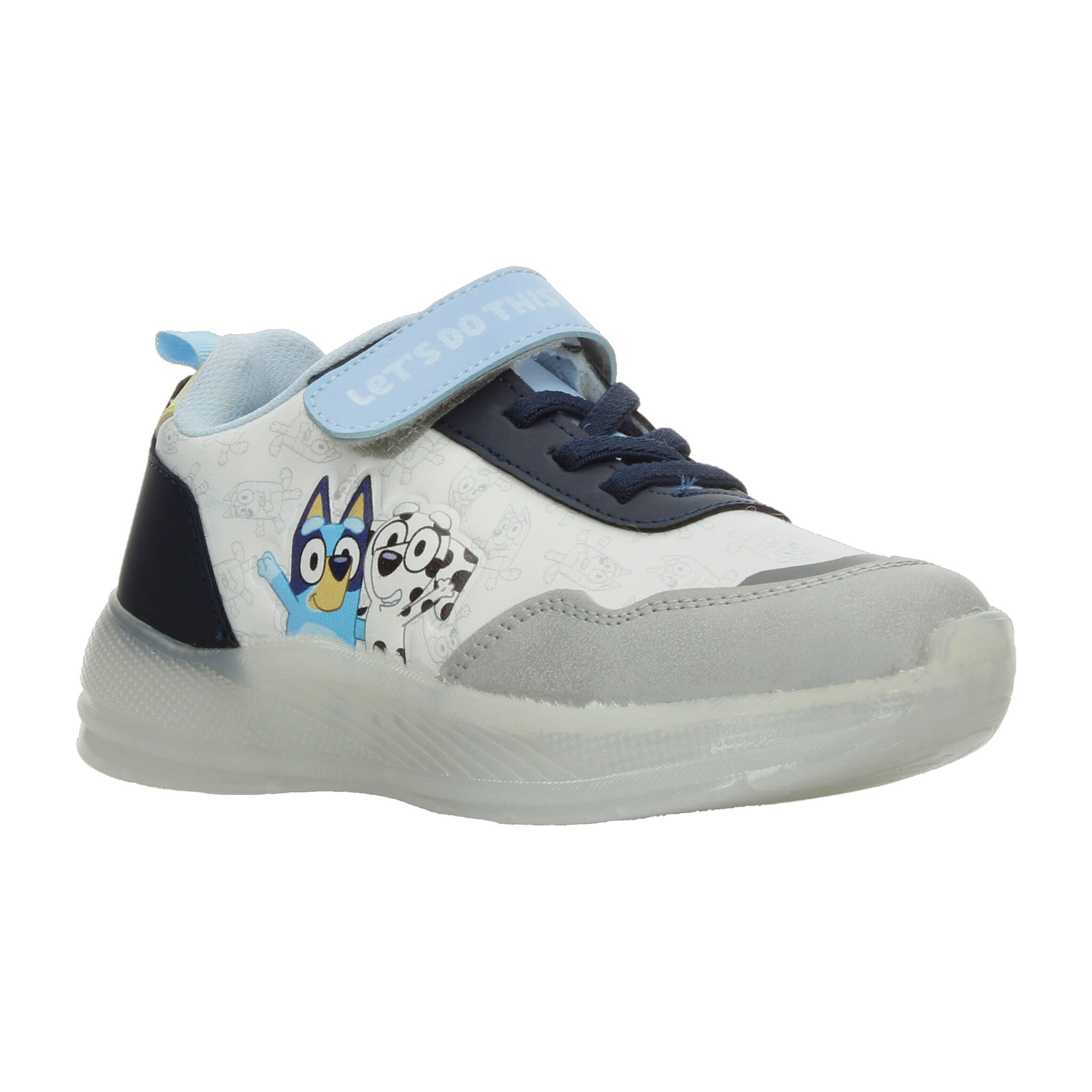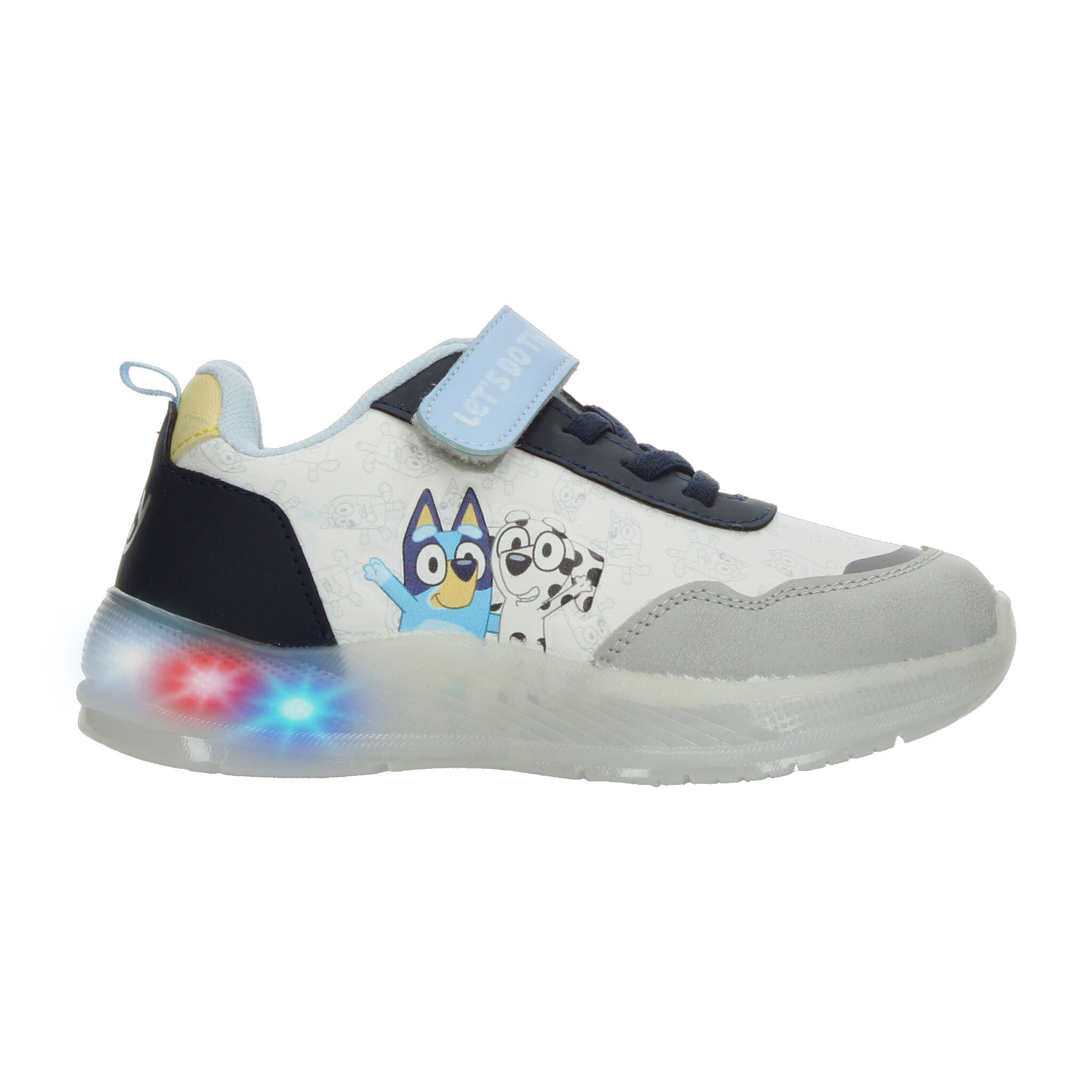 Estos tenis de Bluey para niño son perfectos para acompañar cada una de sus aventuras. Su diseño en color blanco con detalles en azul y gris incluye a los divertidos personajes de la serie, aportando un toque alegre y lleno de energía. La tira de velcro con la frase “LET’S DO THIS” facilita el ajuste, mientras que la combinación con agujetas brinda mayor seguridad. La suela translúcida incorpora luces LED multicolor que se activan al caminar, haciendo cada paso más emocionante. Fabricados con materiales resistentes y de fácil limpieza, ofrecen comodidad y durabilidad para el uso diario. Ideales para quienes buscan estilo, diversión y practicidad en un solo calzado.